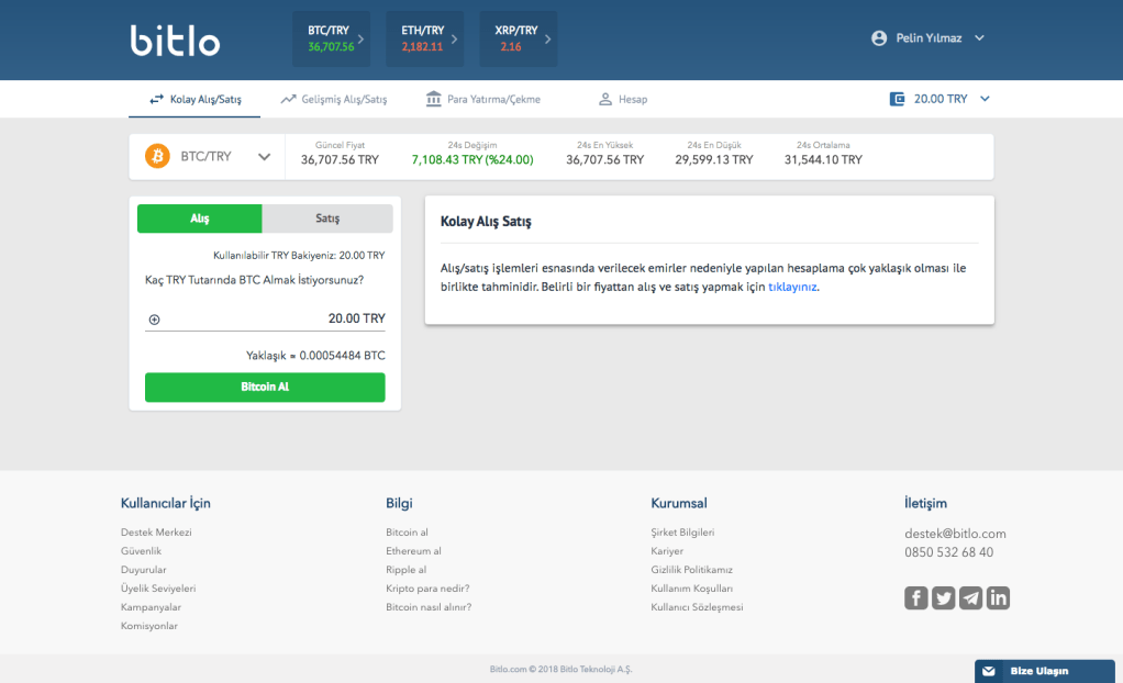 Bitlo için kullanımı en basit kripto para borsası diyebilirim. Siteye girdikten sonra 6 adımda Bitcoin almak mümkün. Kurucu ekibinde Hakan Baş, Alper Afşin Özdemir ve Mustafa Alpay gibi tanınmış girişimciler var. Minimum para yatırma tutarı yok. Bitcoin, Ethereum ve Ripple alınıp satılabiliyor. 7/24 destek var. Google Authenticator gibi ileri güvenlik seçenekleri mevcut. İlk Bitcoin’lerimizi alma zamanı geldi: