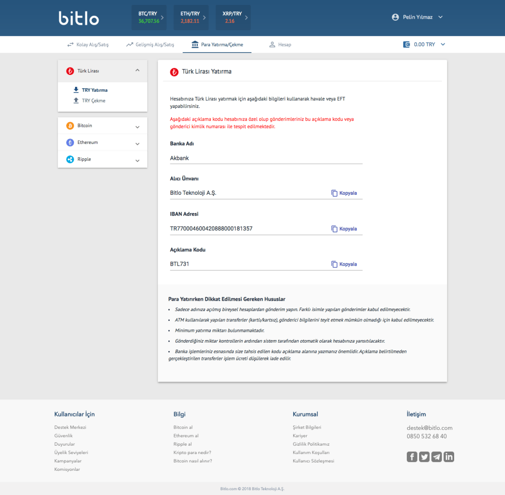 5. BU EKRANDAKİ BİLGİLERİ KULLANARAK İSTEDİĞİMİZ KADAR PARAYI HAVALE VEYA EFT İLE GÖNDEREBİLİYORUZ, MİNİMUM PARA YATIRMA TUTARI YOK. GÖNDERİM YAPTIKTAN SONRA ARTIK HESABIMIZDA TÜRK LİRASI VAR.